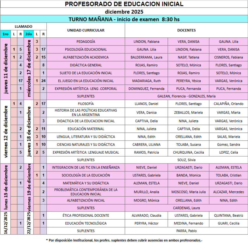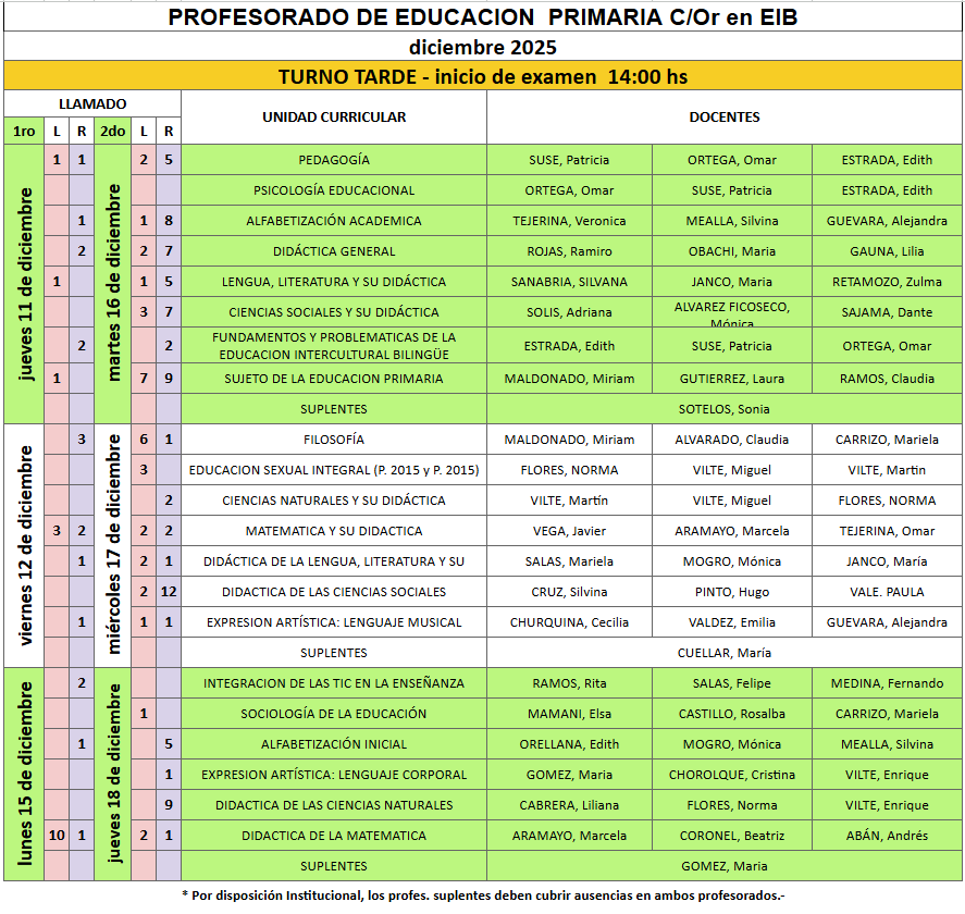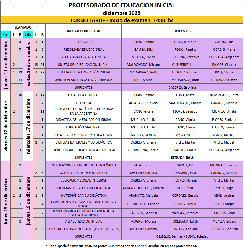 Agendas – Turno de examen ordinario dic/25 (ambos llamados)